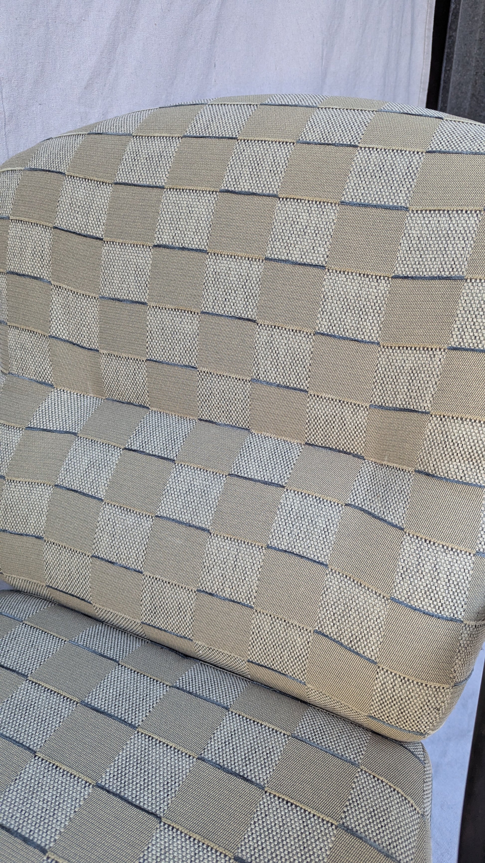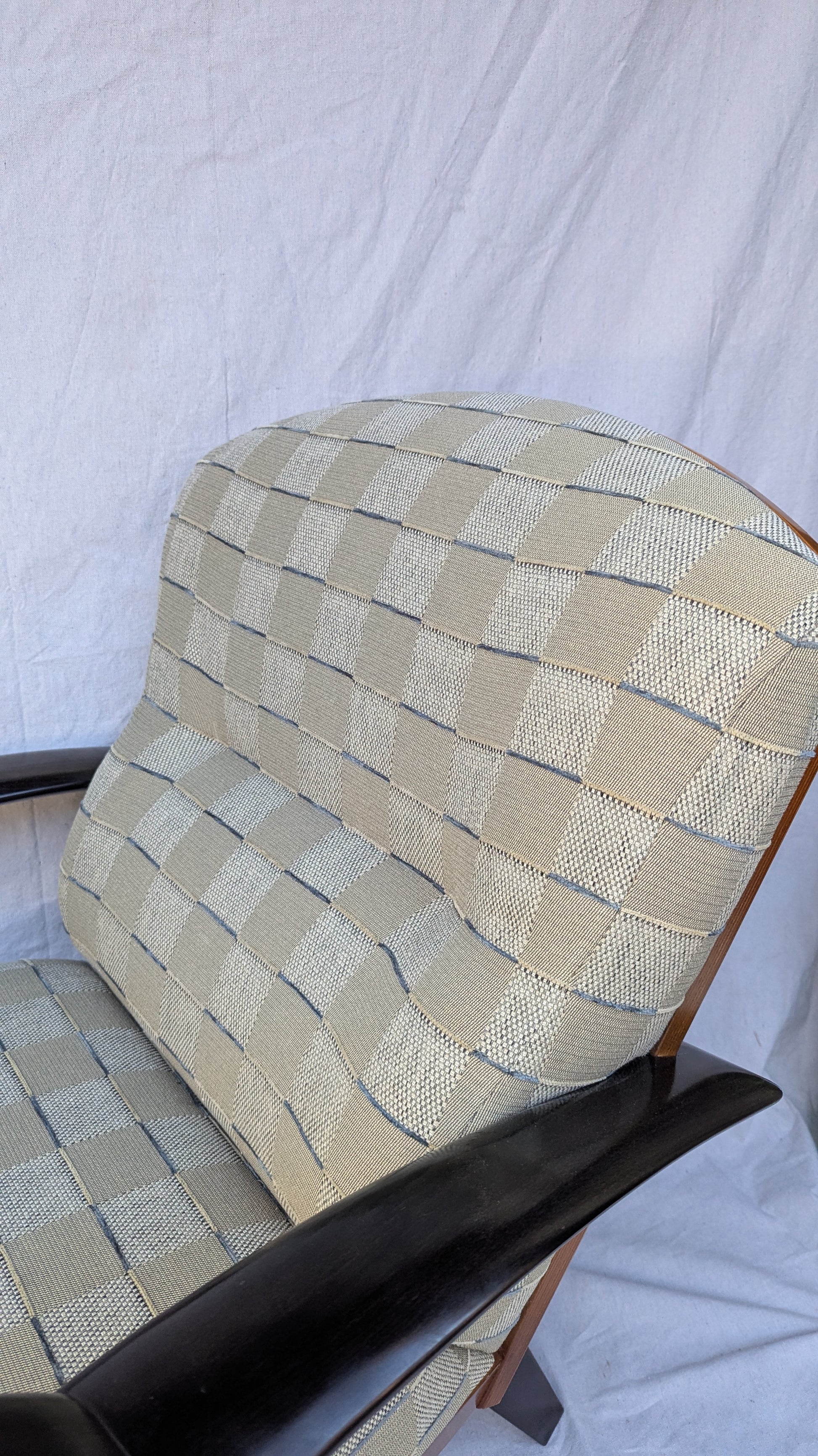 That burl back panel is the whole conversation. Ebonized bentwood arms, original grid-weave fabric, matching ottoman. Tihany designed this for Pace Collection at the height of 1980s luxury - the craft holds up.