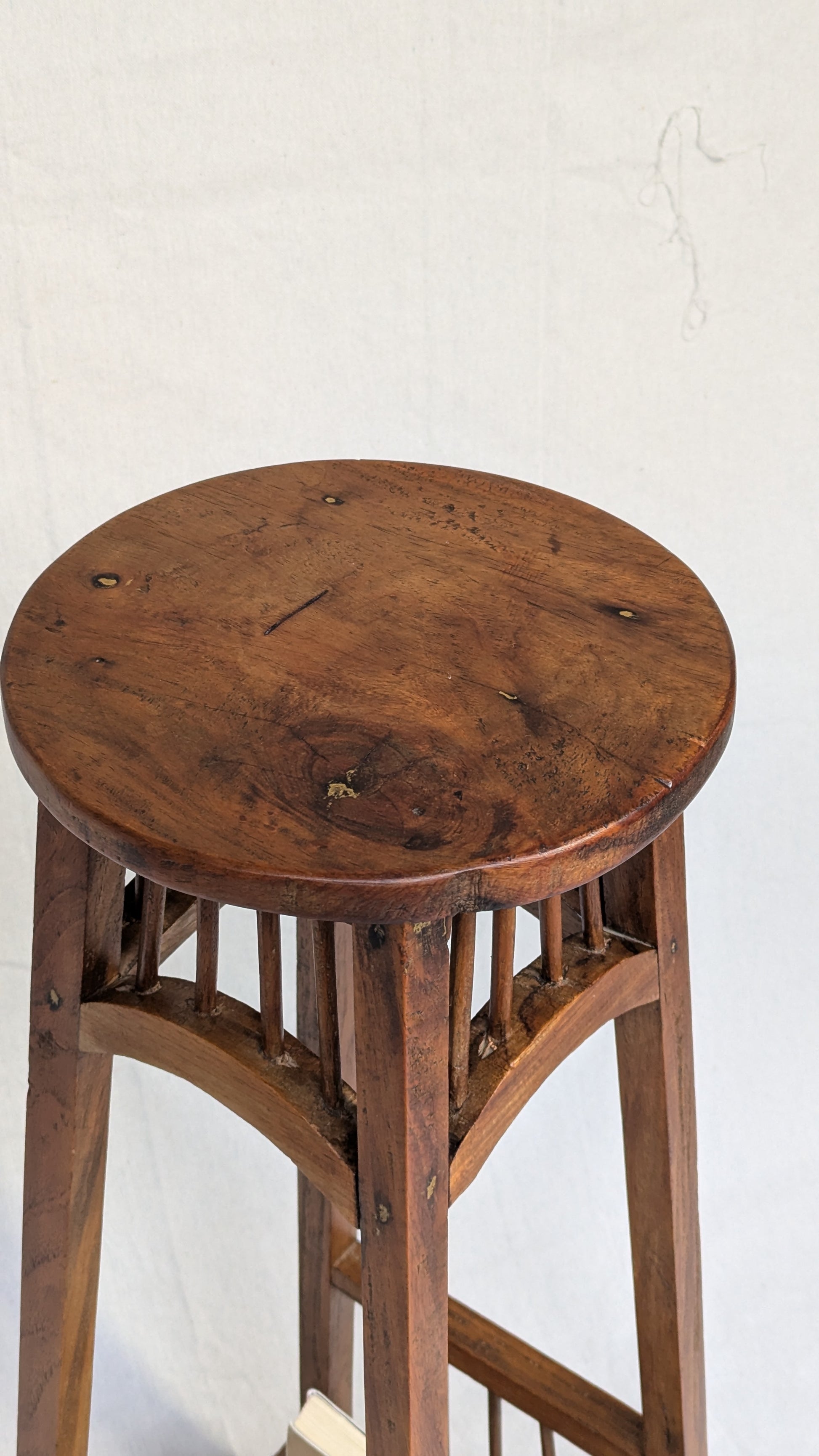 Early 20th-century Arts & Crafts era pedestal stand featuring a circular top and splayed square legs connected by arched aprons. Constructed with a gallery of vertical spindles beneath the top and surrounding the lower square shelf. Likely of British or European manufacture in the Liberty & Co. style, circa 1910.